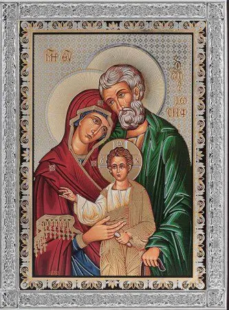Красива ръчно рисувана икона в елегантна сребърна рамка, с ненатрапчиви декоративни елементи на Светото Семейство – Мария, Йосиф и техния син Иисус. Те са символ на християнското семейство и покровителстват дома и неговите обитатели, помагат им да преминат през трудностите заедно и да останат сплотени.Вярва се, че тази икона е най-чистото и свято изображение на семейството.