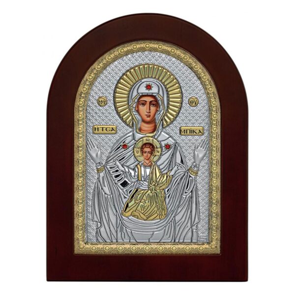 Прелестна икона на Божията Майка. Иконата е поставена в красив иконостас и положена на дървена подложка. Изработена от метална сплав, която съдържа сребро по метода на тънкослойно покритие.