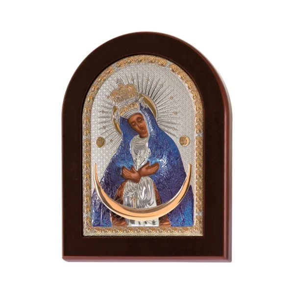 Прелестна икона поставена в красив иконостас и положена на дървена подложка. Изработена от метална сплав, която съдържа сребро по метода на тънкослойно покритие.