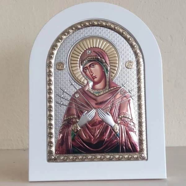 Сребърна икона, цветна, с магнит и бяла рамка на Света Богородица Седмострелна, 4х6см