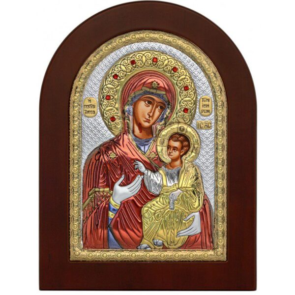 Икона на Света Богородица от метална сплав, която съдържа сребро по метода на тънкослойно покритие. Има кафяв дървен гръб с вградена дървена основа, така че може да се постави на маса, но може и да се окачи