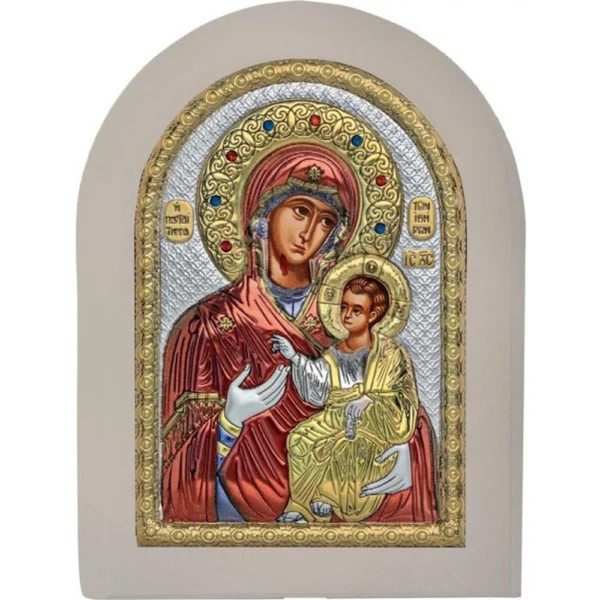 Икона на Света Богородица от метална сплав, която съдържа сребро по метода на тънкослойно покритие. Има бял дървен гръб с вградена дървена основа, така че може да се постави на маса, но може и да се окачи