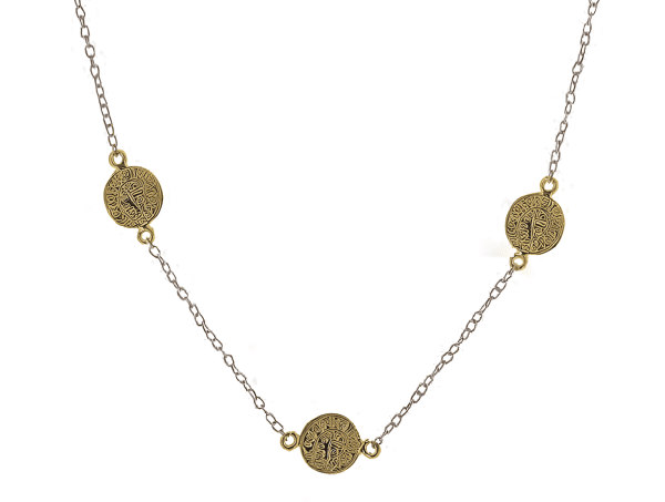 Сребърно колие с 3 позлатени диска Фестос. Дизайнът му се отличава с прекрасна филигранна изработка, много красота и блясък в елегантна последователност от три броя диска Фестос. Нежно и елегантно бижу, идеално за подобряване на различни композиции! Изберете това сребърно колие с три позлатени диска Фестос и бъдете готови за всеки повод!
