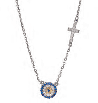 Сребърно колие с кръгла висулка „Синьо око“ от цветни цирконии и кръст с бели цирконии