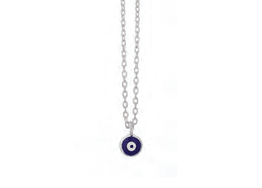 Изработено от висококачествено сребро, това колие се отличава със своя изчистен и стилен дизайн. Кръглата висулка в тъмносиньо представя „Окото на Назар“, известно със своите защитни свойства срещу зли сили и негативната енергия. Този символ не само придава на колието уникален и модерен вид, но и носи със себе си дълбоко значение за защита и благополучие.